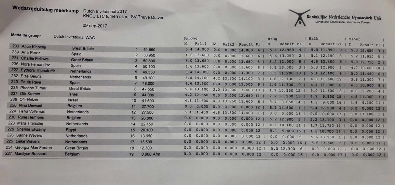 The Dutch Invitational took place in Duiven over the weekend of 9 and 10 September 2017. This competition was the 2nd part of the Dutch Team 2017 Worlds trials and an invitational for gymnasts from Great Britain, Belgium, Spain and Israel. On Saturday the gymnasts competed in an all around/ qualifications meet, while Sunday was the events finals competition.