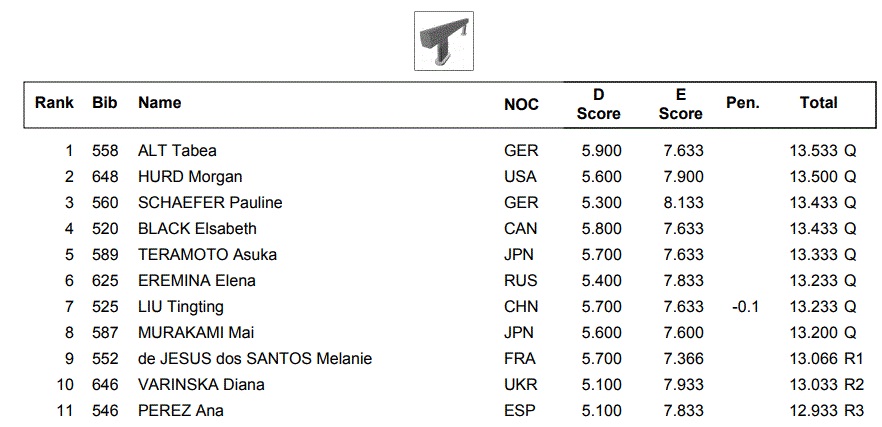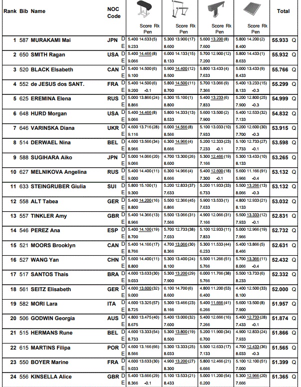 Mai Murakami had an almost perfect competition and leads the all around qualifications: she had scores in the 13s on beam and bars and in the 14s on vault and floor. She will compete in the event finals on vault, beam and floor.
