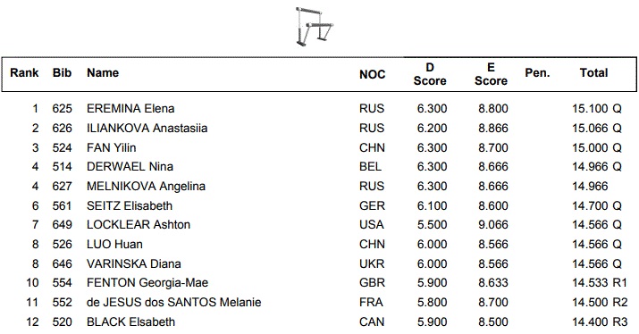 For China Wang Yan had a promising all around performance but a fall on beam and other small mistakes on bars and floor threw her on the 16th place, which she will be able to improve easily on Friday. She qualified for the vault final. Fan Yilin was impressive on bars with splendid turns but had a big step on the dismount; she can improve on the score that put her third in the qualifying rankings on the event.